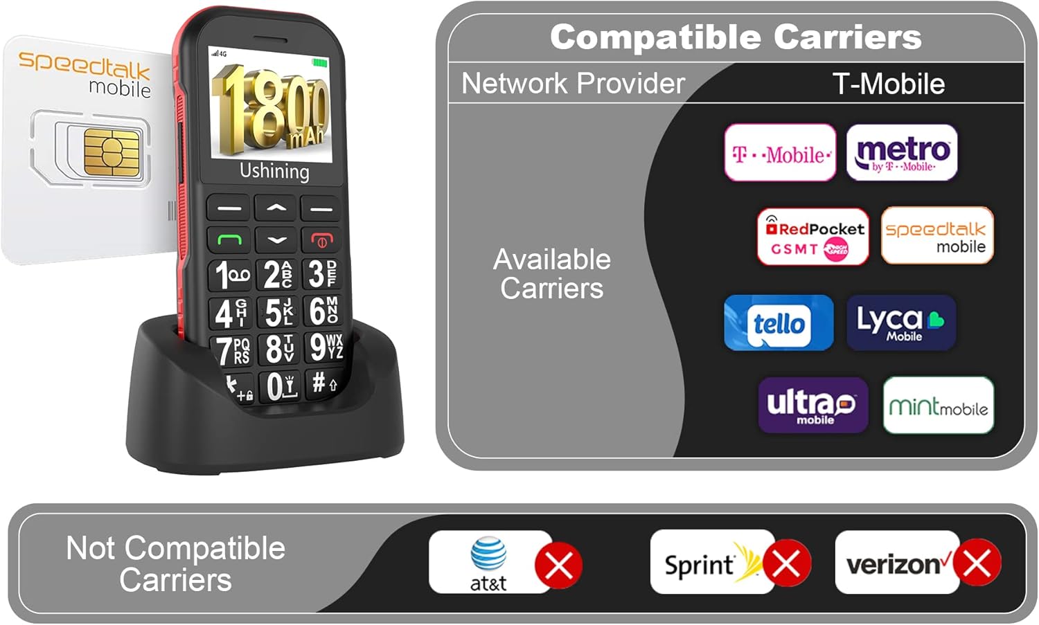【4G LTE network】This senior 4G basic cell phone , Compatible with T-Mobile(Prepaid Plan), MetroPCS, Tello Mobile, Ultra Mobile, SpeedTalk, Simple Mobile, Mint Mobile, Red Pocket(GSMT) and any other carriers that using T-Mobile service; NOT work with CDMA Carriers (Verizon, Sprint, Boost, PagePlus).