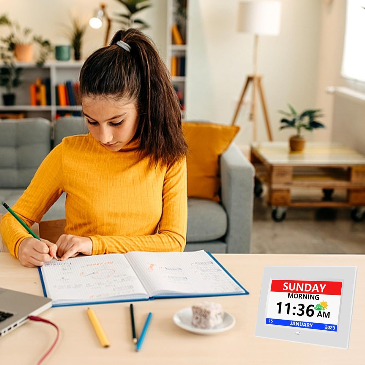 This 7 inch high-resolution digital clock with date and day of the week,clearly display the time, month and date, 4 time period [ morning, afternoon, evening & night], non-abbreviated bold letters without any confusion.