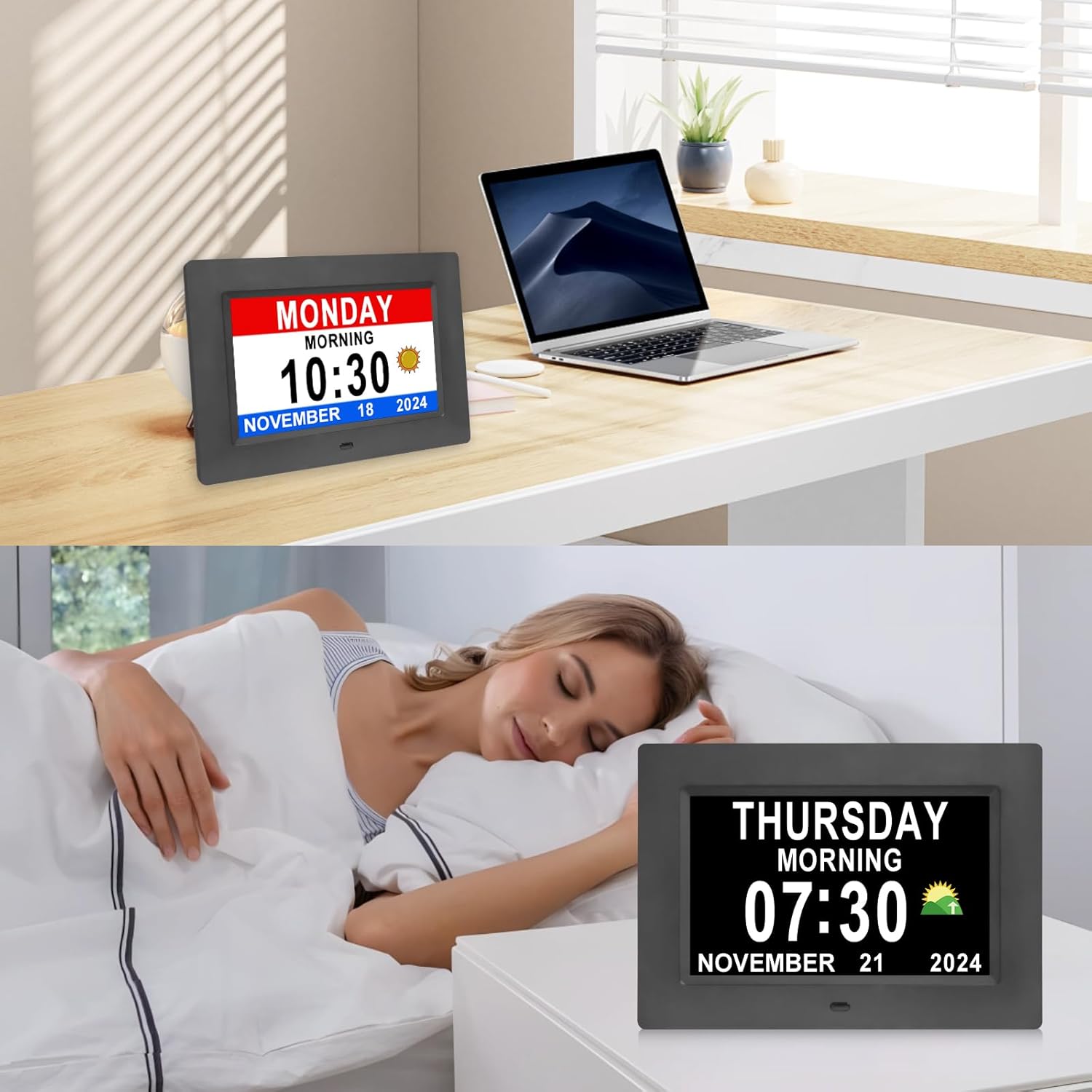🎁【Perfect Gift for Seniors】 The SSINI digital clock is the perfect gift for seniors and their families. It is intentionally designed to exclude sensitive words like dementia, Alzheimer’s, or memory loss, making it suitable for anyone. This clock helps seniors remember the day, ensures important tasks are scheduled on time, and provides a more comfortable and secure living experience. Additionally, it also doubles as a digital photo frame, allowing you to share and display precious photos and memories with your loved ones