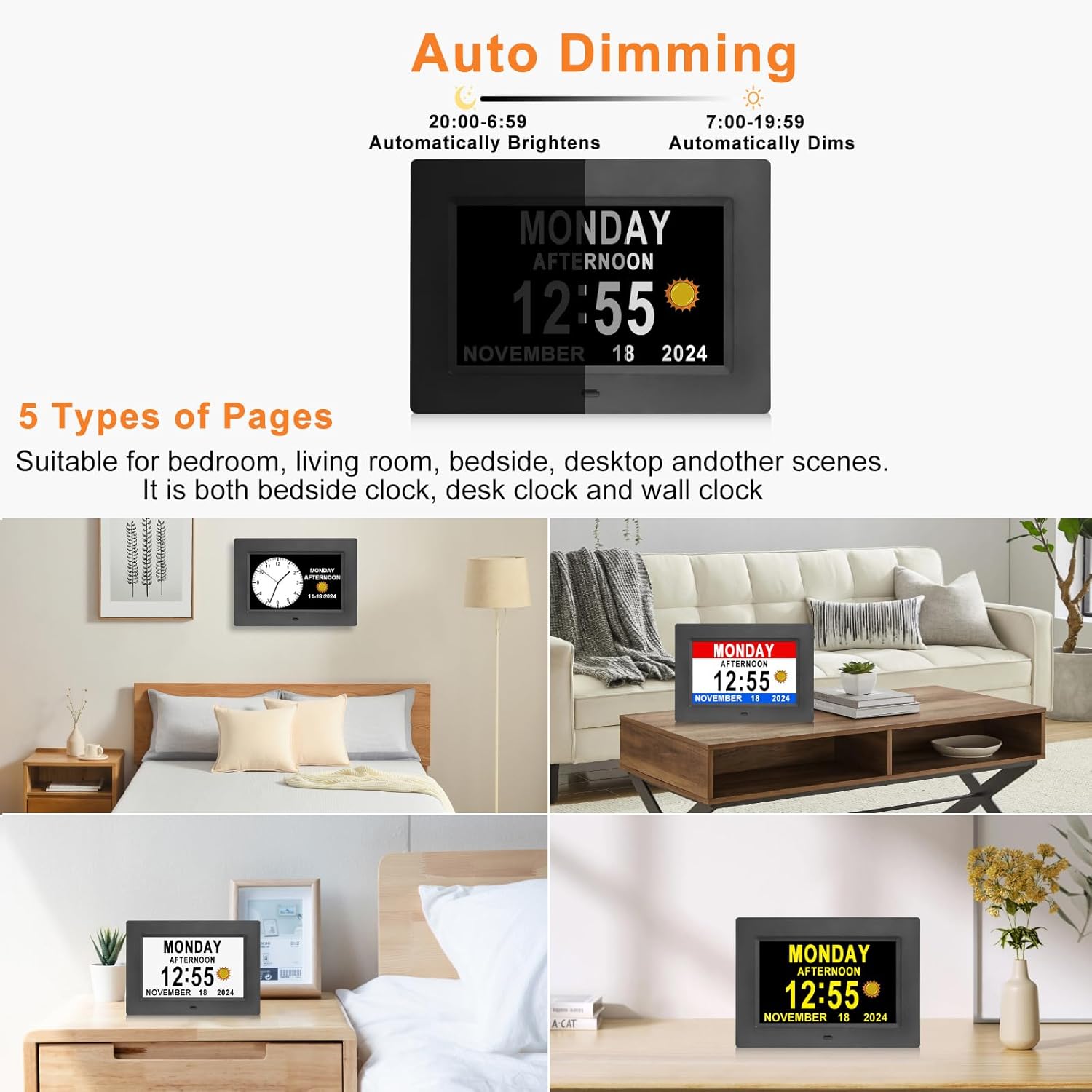 ⏰【Easy to Read Display】 The large display digital clock for seniors has a 7-inch display that clearly displays the time, date, and day of the week in large bold letters. It also shows the five times of the day [ MORNING ,AFTERNOON ,EVENING ,NIGHT,BEFORE DAWN ], avoiding confusing abbreviations and allowing you to see them at a glance. 5 display modes: elderly clock, wall clock, color clock, Modern Style Clock, Minimalist Style Clock. It can be used as a home decoration item, suitable for bedroom, living room, bedside, desktop and other scenes. It is both a bedside clock and a desk clock and a wall clock. It can also be used as a children’s alarm clock