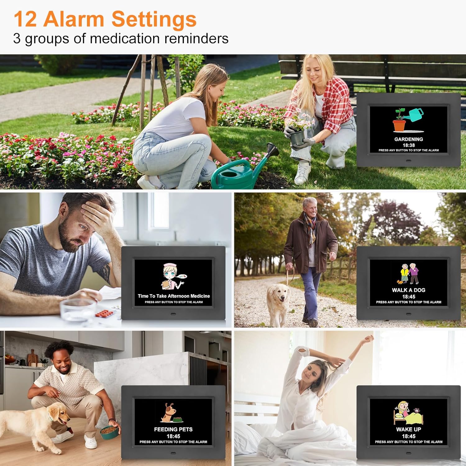 ⏰【12 Alarms and 3 Sets of Medication Reminder】The dementia clock can be set with 12 daily alarms and 3 sets of medication reminders. Reminding us of daily meetings, showers, medications, clinics, dog walks, etc., helps us avoid missing any important events. The digital clock also supports 8 different languages