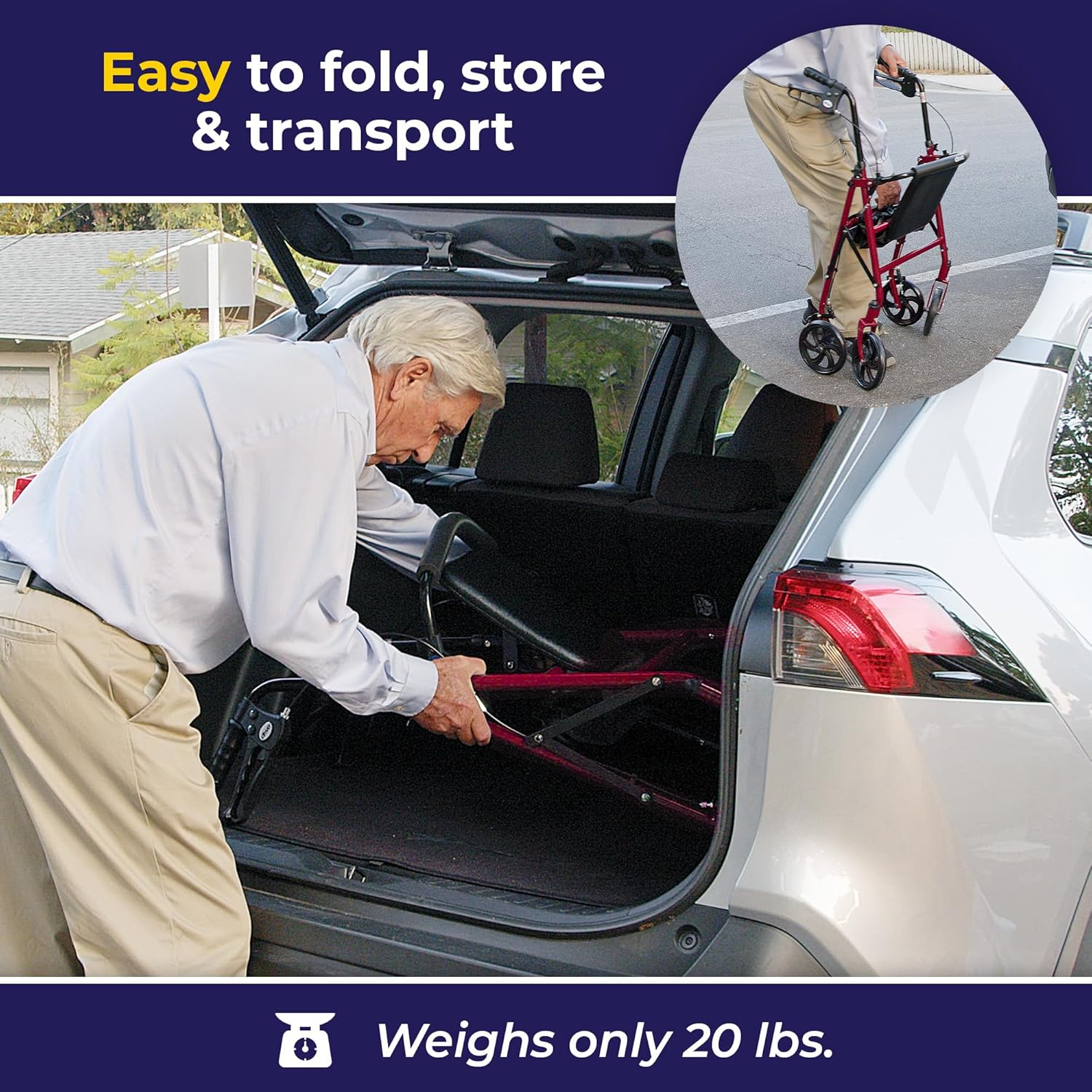 Rolling Walker with Seat: Stable, strong and stylish, this steel rollator features a durable and supportive frame, a comfortable seat, and an under-seat storage pouch; a great walker for seniors and adults seeking stability in a smaller-than-average footprint