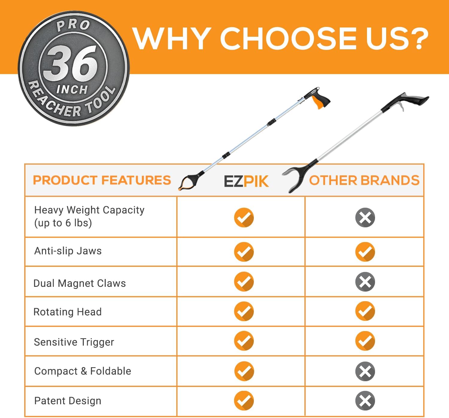 AWARD-WINNING DESIGN: Experience the gold standard in reacher tools with our patented 36″ folding grabber. Boasting a 5lb vertical lift capacity, 360° rotating jaw, and dual magnetic tips, it outperforms competitors in versatility and functionality. Perfect for seniors, disabled individuals, and post-surgery recovery.