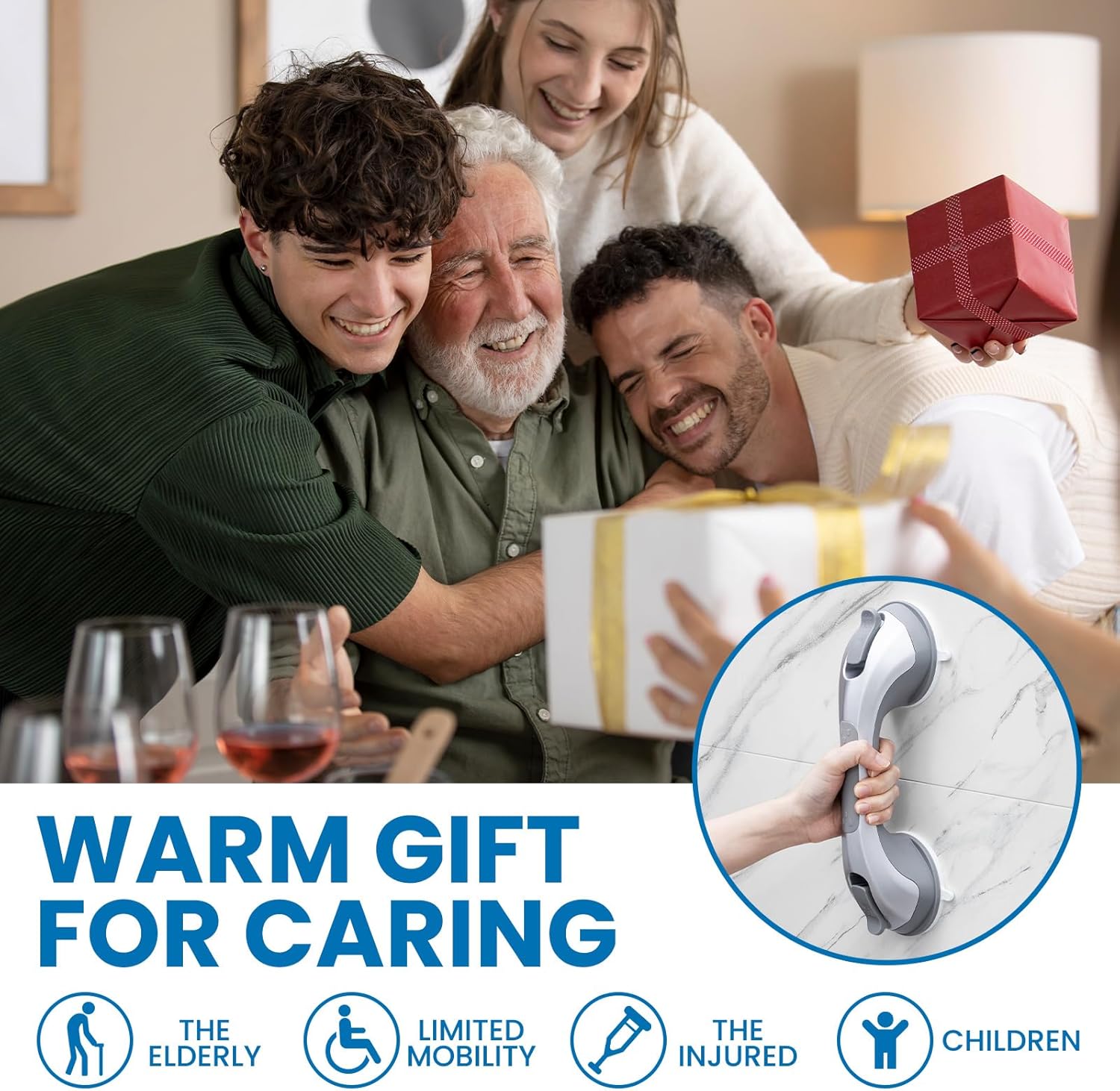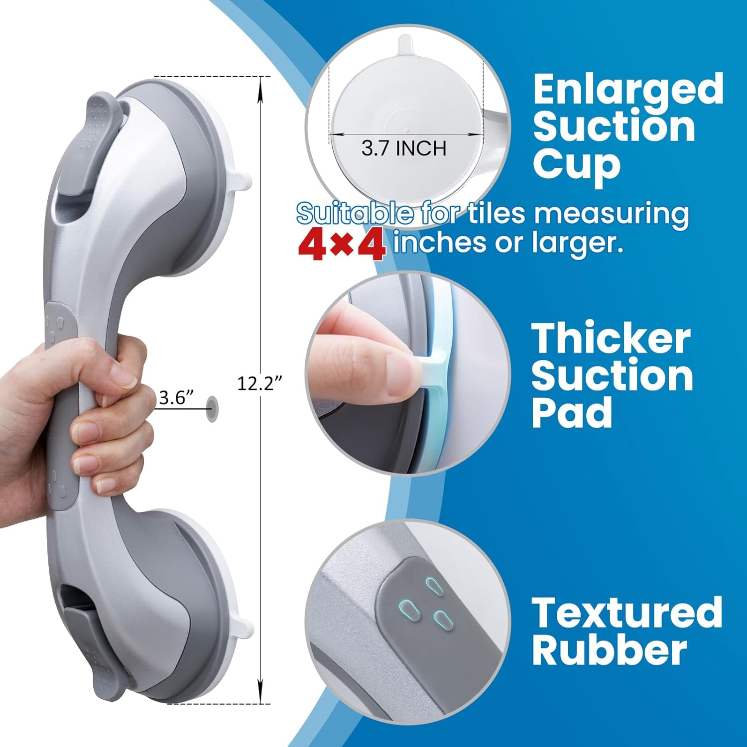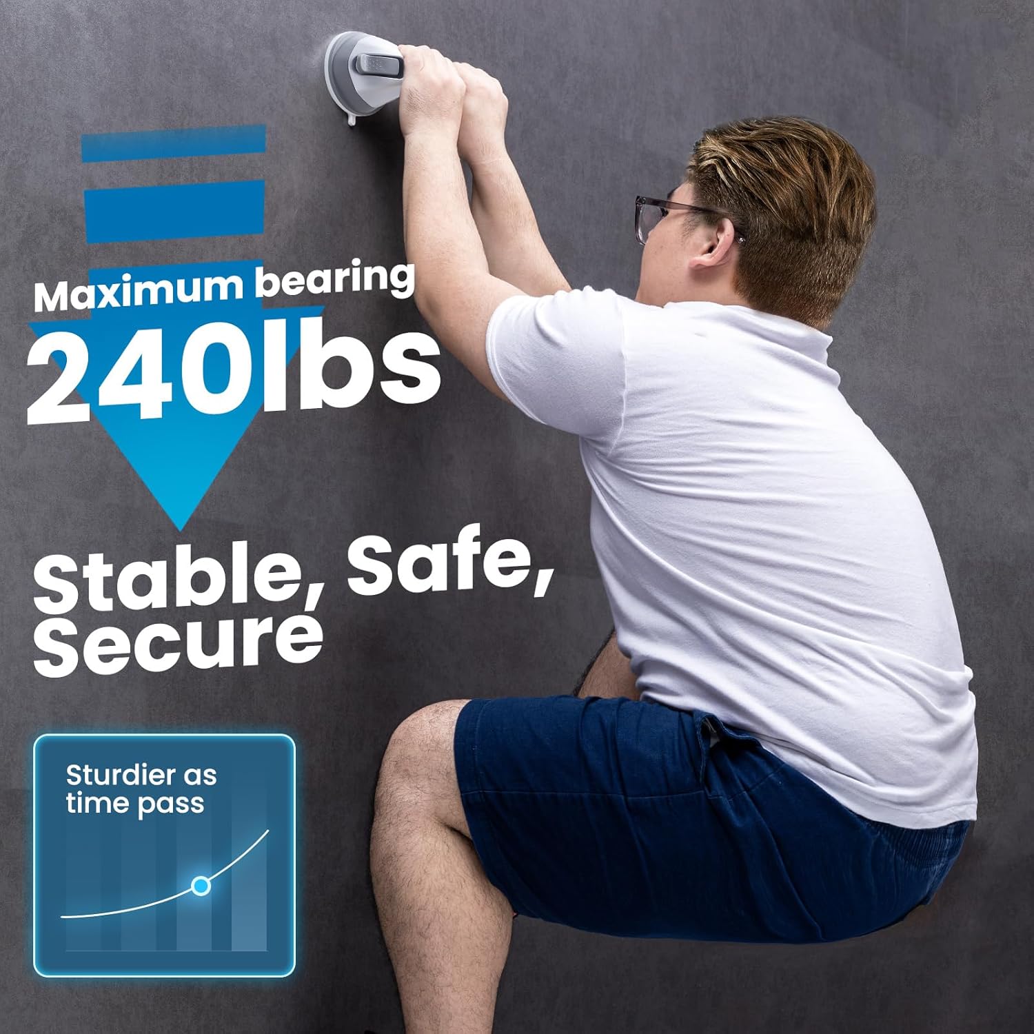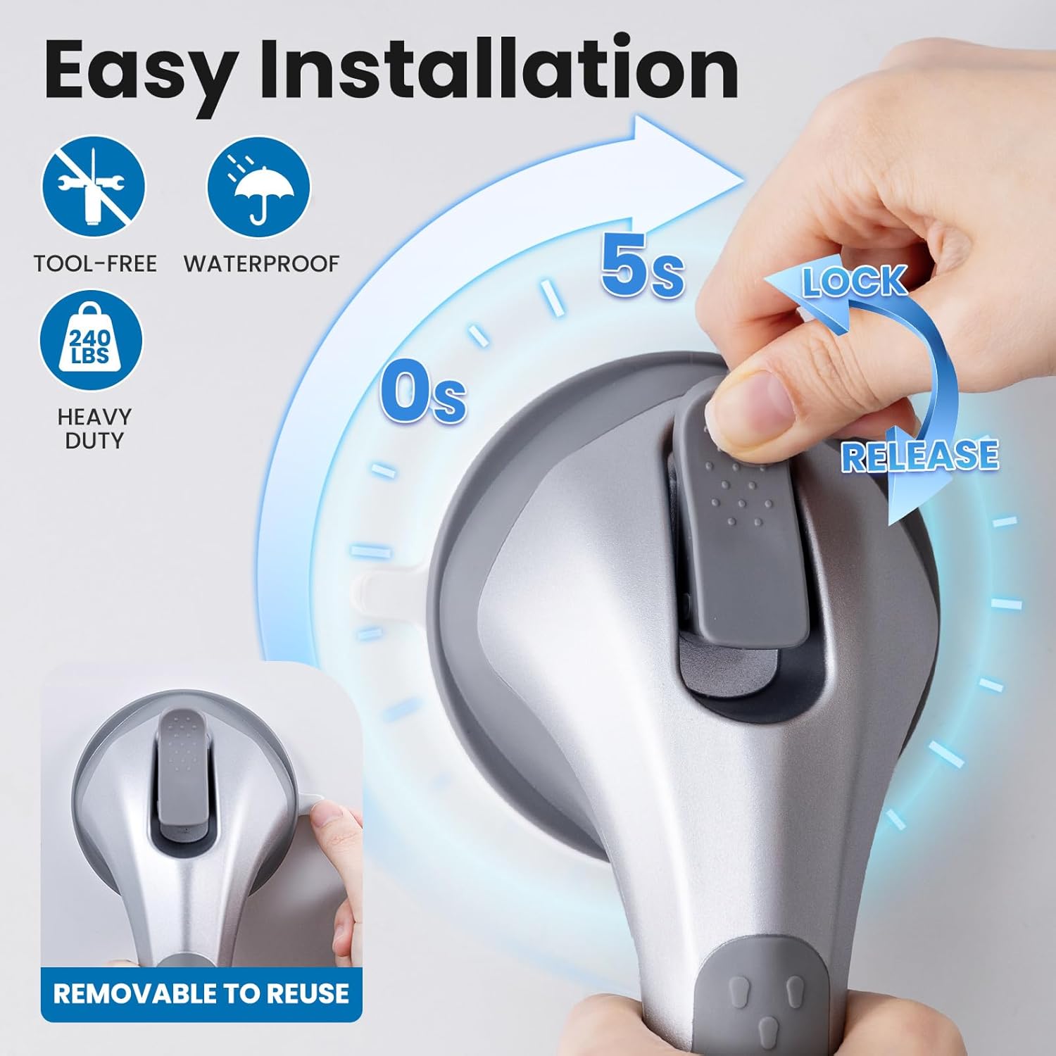 Strong Suction: LEVERLOC patented suction cup shower grab bar applies octopus bionic technology, which can provide strong vacuum suction on wall and has maximum 240lbs heavy duty EACH, fully waterproof, staying sturdy and stable. Please make sure the grab bar for shower is adhered properly