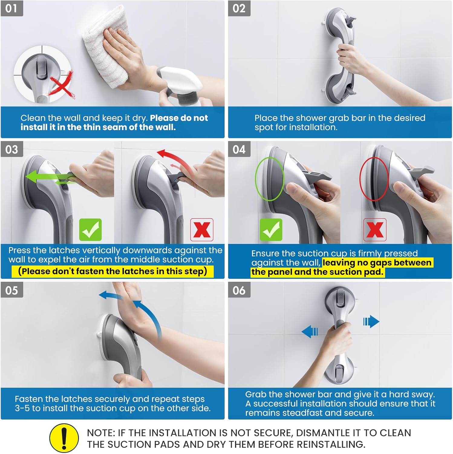 Easy Installation: Considering how inconvenient it could be to waste long time on installation. LEVERLOC Shower Handle needs No drilling, no glue, no nails, no tool! Just clean the wall, press the suction grab bar on the wall for 5 seconds and lock latches then it’s done! Not only it’s quick and easy installation, but also removable and reusable. Release the latches to remove it then easily clean it with water, and you can reinstall it again.(Press suction for 5 seconds BEFORE locking latches)