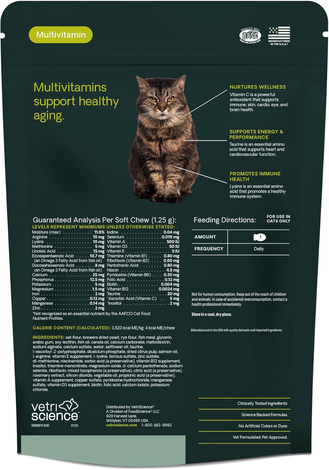 Science-Backed Ingredients: This senior cat multivitamin includes key ingredients like taurine, vitamins A, C, and E for antioxidant protection, biotin and methionine for skin and coat, and Omega-3 and -6 fatty acids from fish oil to support joints and brain function